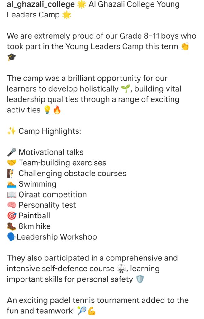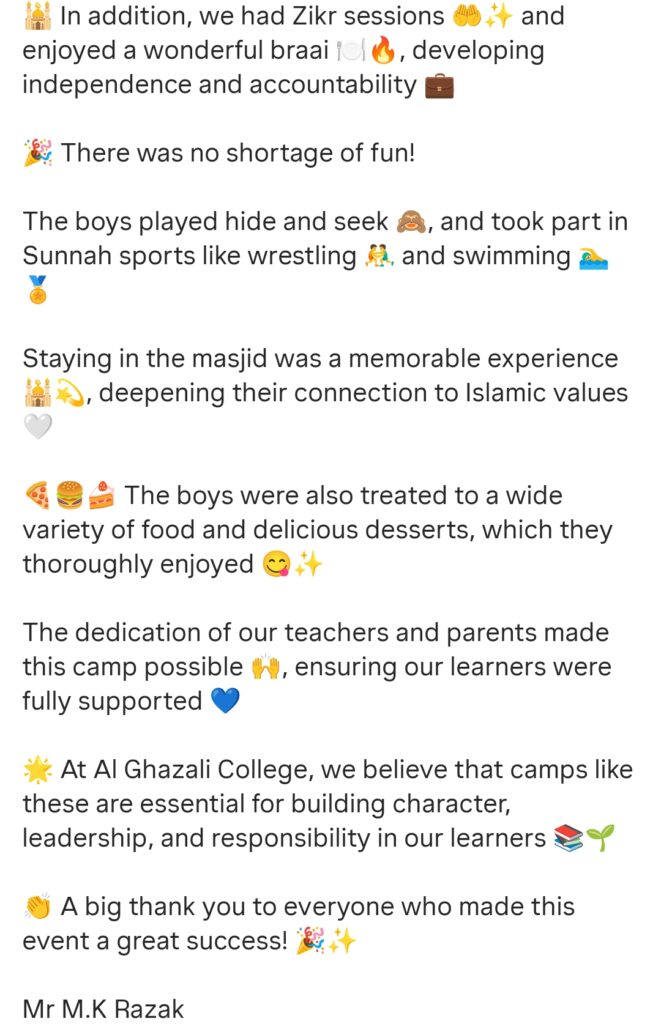 News Al Ghazali College – Young Leaders Camp Association of Muslim Schools3rd April 20263rd April 2026 33Views Share Facebook Twitter Pinterest Read Time:0 Second About Post Author Association of Muslim Schools abdulgafoor.mohamed@ris.org.za Happy 0 0 % Sad 0 0 % Excited 0 0 % Sleepy 0 0 % Angry 0 0 % Surprise 0 0 %